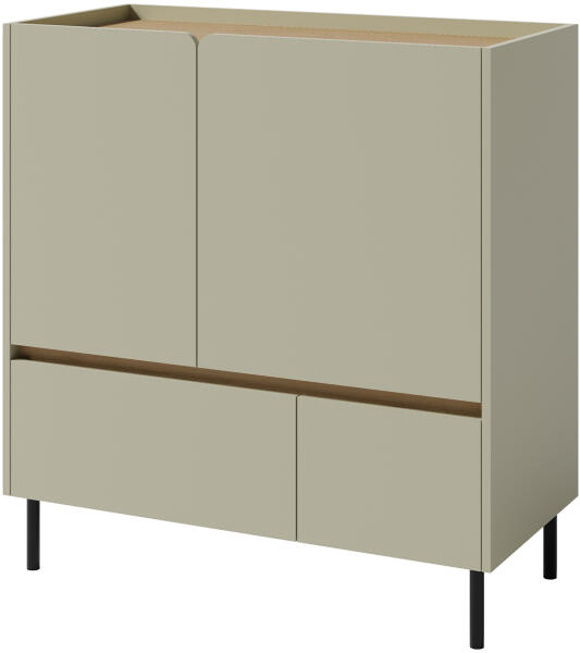LUCA modern zöld komód magas fekete fém lábakkal. A kétfiókos komód igazán praktikus és elegáns megoldást jelent minden hálószobába vagy gyerekszobába. Minden ajtós szekrény mögött egy-egy polc helyezkedik el. Számos tároló helyet biztosít a ruhaneműknek, kiegészítőknek, fehérneműknek és egyéb apróságoknak. A tetejére is elhelyezheti a dísztárgyait vagy növény