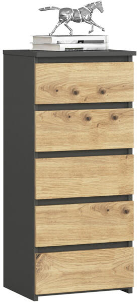 Modern, keskeny komód 5 tágas fiókkal, amely tökéletes tárolási megoldást kínál kisebb terekbe. A grafitszürke korpusz és artisan tölgy frontok elegáns kontrasztot alkotnak, míg a kiváló minőségű laminált lap és ABS élzárás tartósságot biztosít. Elegáns tárolási megoldás kompakt méretbenA CL5 keskeny komód tökéletes választás azoknak, akik maximálisan ki szer