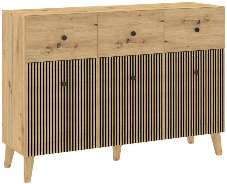 Tágas és modern NELLY K3 komód két ajtós résszel és három fiókkal. A bútor darab minőségi laminált 16 mm vastag bútorlapból készül. A komód fekete műanyag fogantyúkkal rendelkezik. Középen három tágas fiókkal rendelkezik, a két oldalán pedig a lamellákkal díszített ajtók mögött egy-egy polc helyezkedik el. A komód tetejére is elhelyezhet apróságokat, dísztárg