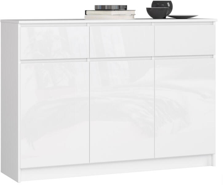 Modern, elegáns komód magasfényű fehér kivitelben, 3 ajtóval és 3 fiókkal. Kiváló minőségű 16 mm-es laminált bútorlapból készült, ABS élzárással a tartósság érdekében. Elegáns tárolási megoldás modern otthonokbaEz a modern vonalvezetésű komód tökéletes választás azoknak, akik a letisztult dizájnt és a praktikus tárolást egyaránt fontosnak tartják. A magasf