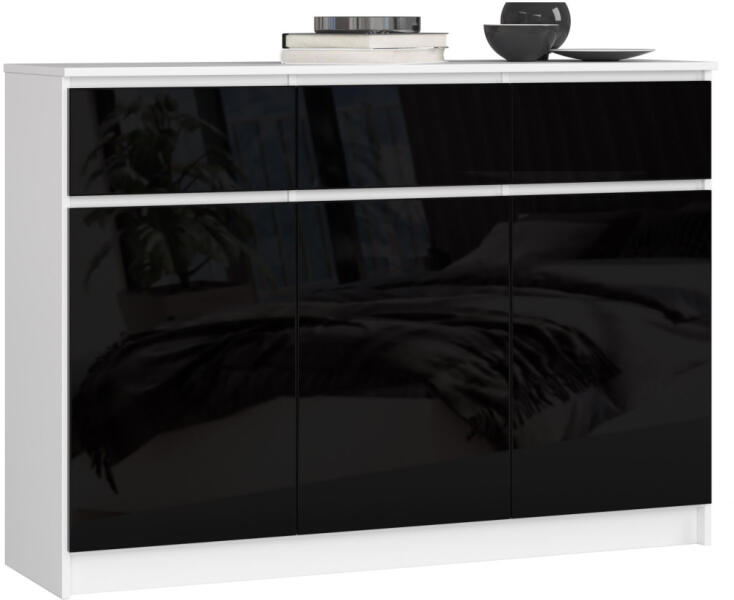 Modern, elegáns komód fehér korpusszal és magasfényű fekete frontokkal, amely három fiókkal és három ajtóval rendelkezik. Kiváló minőségű 16mm-es laminált bútorlapból készült, ideális tárolási megoldást kínál a nappaliba vagy hálószobába. Elegáns tárolási megoldás modern otthonokbaEz a prémium kivitelű komód tökéletesen ötvözi a funkcionalitást és a stíl
