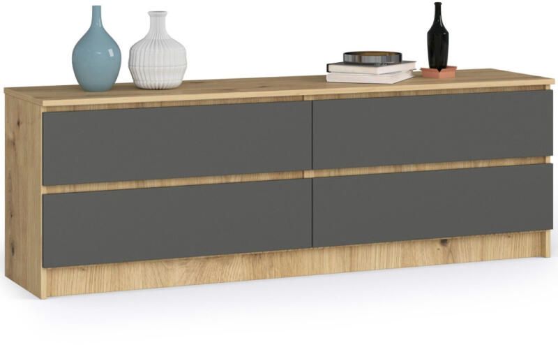 Modern, széles komód 4 tágas fiókkal, kopásálló laminált lapból készítve. Az Artisan tölgy test és szürke matt frontok elegáns kombinációja tökéletes tárolási megoldást kínál nappalijába vagy hálószobájába. Elegáns tárolási megoldás modern otthonokbaEz a 160 cm széles komód tökéletesen ötvözi a funkcionalitást és a stílust. A természetes Artisan tölgy ko