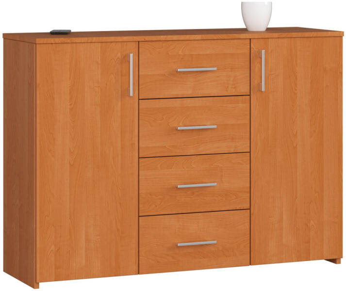 Modern és praktikus K45 komód égerfa színben, 4 fiókkal és 2 ajtóval. Tartós laminált lapból készült, ABS élzárással és ezüst fogantyúkkal, tökéletes tárolási megoldást kínál a nappaliba vagy hálószobába. Elegáns tárolási megoldás az Ön otthonábaA K45 komód egy sokoldalú bútordarab, amely egyesíti a funkcionalitást és az esztétikumot. A 110 cm széles, 80 c