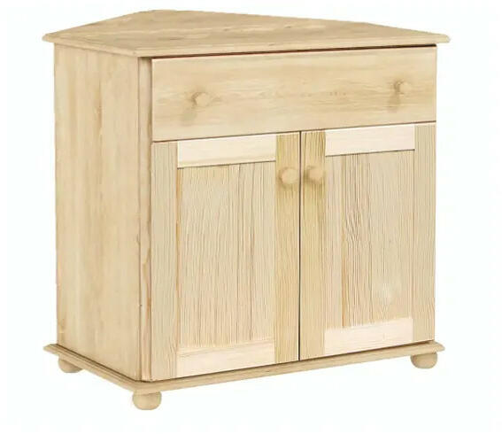 Minimalista és elegáns forma. Használható hálószobában is ruhákhoz, játékok, könyvekhez, vagy akár iratokhoz és dokumentumokhoz. Tömör fenyőből készült termék. Lapraszerelve érkezik! Ez az egyedi megjelenésű és formájú fa sarok komód sokoldalú használatot tesz lehetővé különböző helyiségekben. A komód praktikus fiókkal rendelkezik, amelyben különféle termé