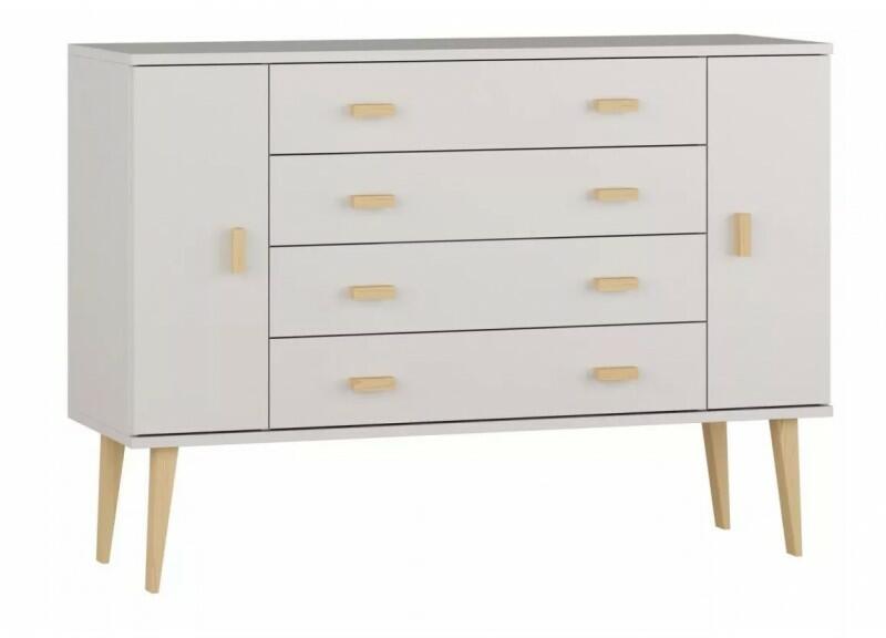 A komód teljes egészében tömör fenyőfából készült. A komód fehér környezetbarát lakkal és színtelen lakkal van lakkozva. Lapraszerelve érkezik! Ez a 2 ajtós, 4 fiókos komód tömör fenyőfából készült, amelyet gondos és precíz kidolgozás jellemez. Fehér ökológiai és átlátszó lakkal van lakkozva, ami garantálja a 100%-os végső hatást. A komód fiókjai görgős