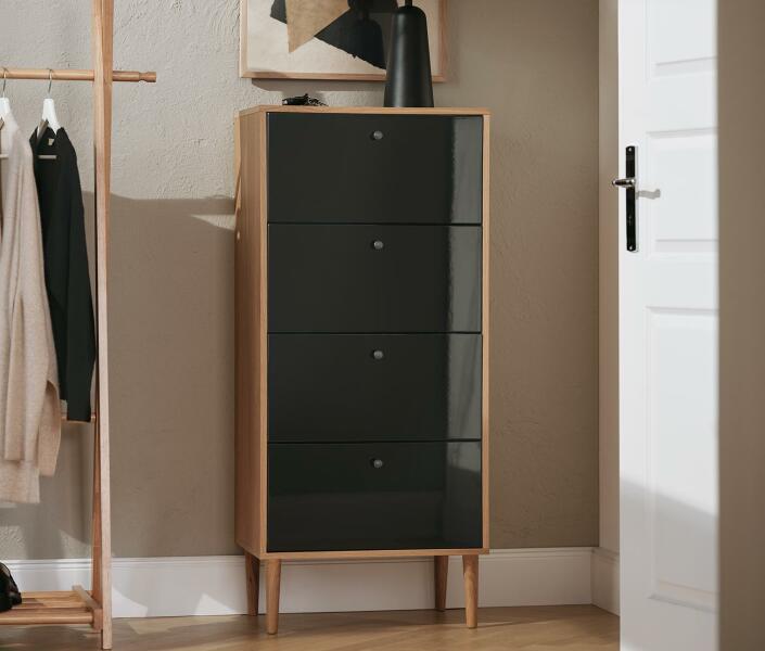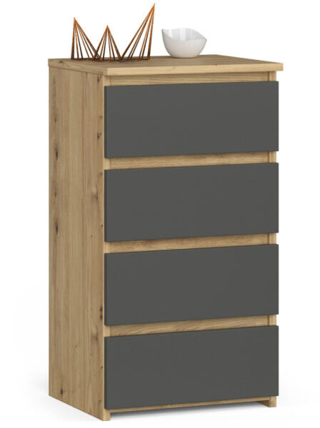Modern és praktikus fiókos komód 4 tágas fiókkal, amely tökéletes tárolási megoldást kínál. Az Artisan tölgy és szürke színkombináció elegáns megjelenést biztosít, miközben a kiváló minőségű laminált lap tartósságot garantál. Elegáns tárolási megoldás modern otthonokbaAz AKORD CL4 komód tökéletes választás azoknak, akik praktikus, mégis stílusos tárolási