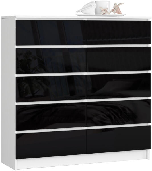 Modern, tágas komód 10 fiókkal, amely elegáns fekete magasfényű frontokkal és fehér matt korpusszal rendelkezik. Tökéletes tárolási megoldást kínál 160 cm szélességével és 121 cm magasságával, miközben stílusos kiegészítője lehet bármely helyiségnek. Elegáns tárolási megoldás modern otthonokbaEz a prémium kivitelű komód tökéletesen ötvözi a funkcionalitást