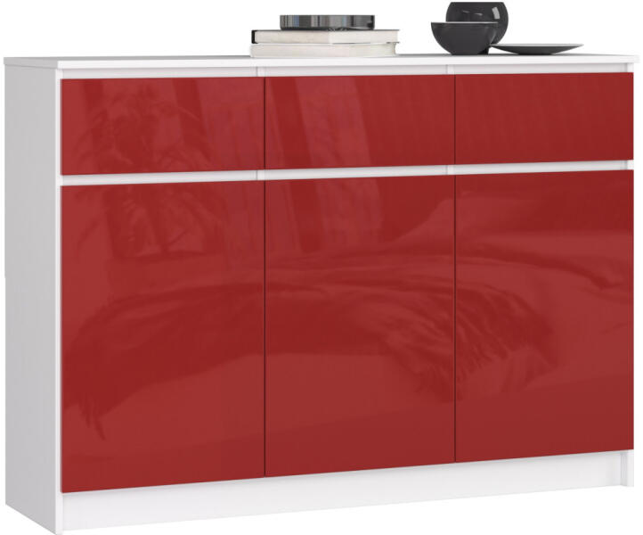 Modern, elegáns komód fehér korpusszal és magasfényű piros frontokkal, amely tökéletes tárolási megoldást kínál nappalijába. A 138 cm széles bútor három ajtóval és három fiókkal rendelkezik, kiváló minőségű laminált bútorlapból készült. Elegáns tárolási megoldás modern otthonokbaEz a stílusos komód tökéletesen ötvözi a funkcionalitást és a modern dizájnt