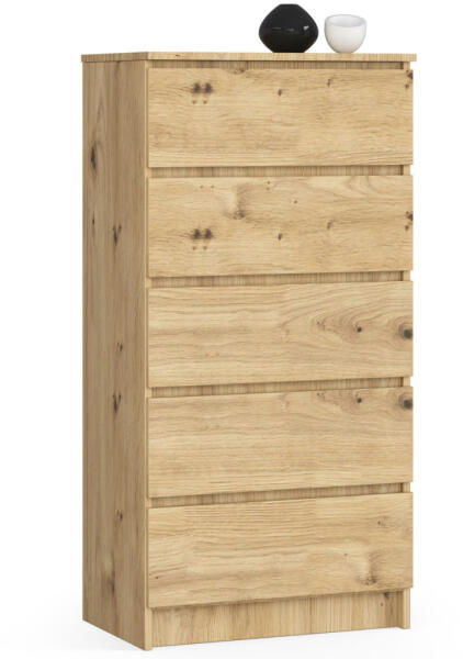 Modern és praktikus 5-fiókos komód, amely tökéletes tárolási megoldást kínál. A matt artisan tölgy kivitelezés és a kiváló minőségű laminált lap kombinációja elegáns megjelenést és tartósságot biztosít. Elegáns tárolási megoldás modern otthonokbaAz AKORD CLP komód ötvözi a funkcionalitást és a stílust. A 16 mm vastag, kopásálló laminált lapból készült b