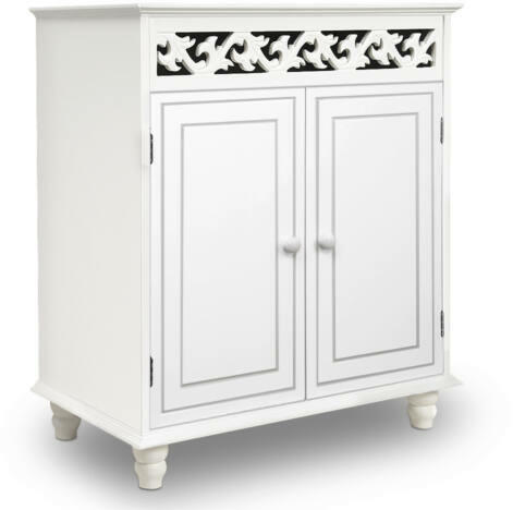 Gyönyörű komód sok tárhellyel! Ez a játékos, vidéki stílusú Jersey komód különleges fadíszítéseivel lenyűgöz, és antik hangulatot kölcsönöz nappalijának. A 76 x 65 x 35 cm-es méretekkel rendelkező komód 2 szinten bőséges helyet és tárolóhelyet biztosít. A kivehető polcnak köszönhetően nagyobb dolgok is tárolhatók benne. Eredeti bútor , amely tökéletesen kom