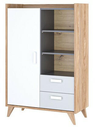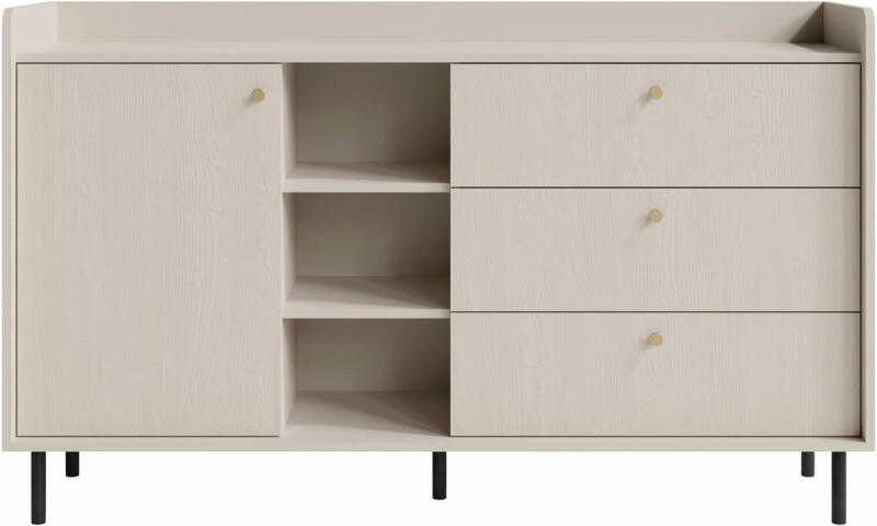 A bézs színben kapható GRANDE 153 komód univerzális bútor, amely minden helyiségben jól mutat. A nappalin kívül elhelyezhető az előszobában vagy akár a folyosón is, ahol a sapkák, kesztyűk és papucsok tárolása a fő cél. Változatos tárolóhely kialakítással rendelkezik: egy szekrényt, három nyitott polcot és három fiókot tartalmaz. A minőségi alapanyagokból (lamin