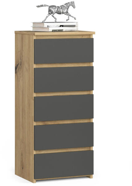 Modern, keskeny komód 5 tágas fiókkal, amely tökéletes megoldást nyújt a kisebb terekbe. Artisan tölgy korpusz és matt szürke frontok kombinációja elegáns megjelenést kölcsönöz ennek a praktikus tárolóbútornak. Elegáns tárolási megoldás kompakt méretbenAz AKORD CL5 komód tökéletes választás azoknak, akik stílusos, mégis praktikus tárolási megoldást keresnek. A 40