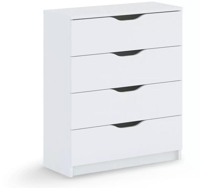 A széles fehér négyfiókos KELLY 4S komód jó választást jelent mindazok számára, akik egy minimalista bútordarabot keresnek. A 90 cm magasságának és a 71 cm szélességének köszönhetően számos tároló hellyel rendelkezik. A széles komód minőségi 16 mm vastag laminált forgácslapból készült, amely garantálja az ellenálló képességét és a könnyű karbantartását. N