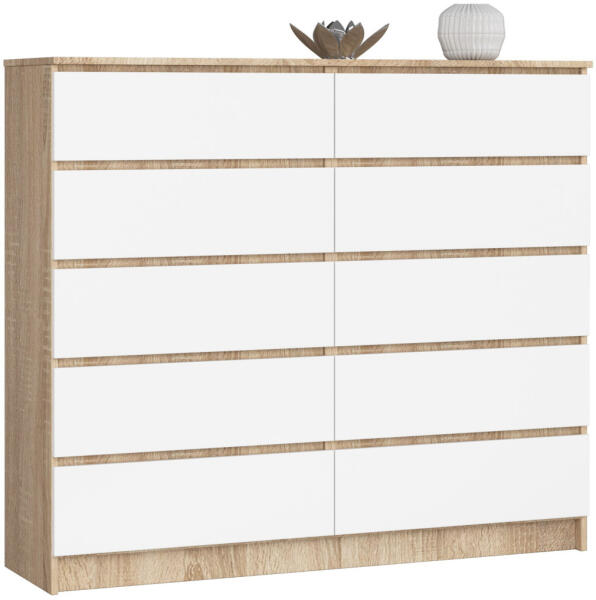 Modern, tágas komód 10 fiókkal, amely tökéletesen ötvözi a sonoma tölgy és fehér színvilágot. A 138 cm széles bútor kiváló tárolási megoldást kínál bármely helyiségbe, kopásálló laminált lapból készült. Elegáns tárolási megoldás modern otthonokbaEz a modern vonalvezetésű komód tökéletesen ötvözi a sonoma tölgy test és a fehér frontok időtlen eleganciáj