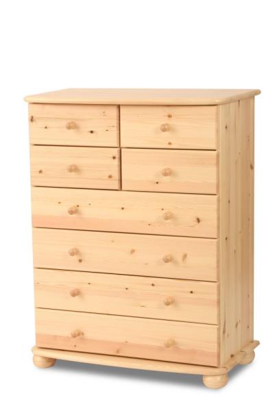 Tömör borovi fenyőből készült, magyar termék. Pogácsa lábas komód, kerekített sarkokkal. 4 nagy fiókos, 4 kis fiókkal. 85cm széles, 110cm magas, 45cm mély. Igény szerint kérhető oldalsó perem nélkül is (80cm széles) Egyben szállítják. Az Anikó 8 fiókos komód ívelt kialakításával a klasszikus vonalakat követi. Alapanyaga skandináv borovi fenyő, összeszerelést ne