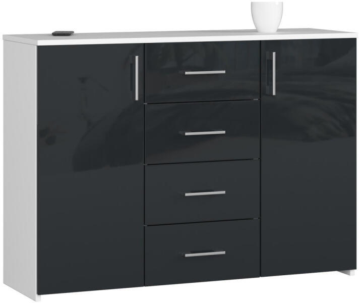 Modern K45 komód fehér korpusszal és magasfényű grafit frontokkal, amely 4 fiókkal és 2 ajtóval kínál bőséges tárolóhelyet. A 110 cm széles bútor tökéletes választás a kortárs lakberendezéshez. Elegáns tárolómegoldás modern otthonokbaA K45 komód a modern dizájn és praktikus funkcionalitás tökéletes ötvözete. A fehér korpusz és a magasfényű grafit frontok kontr