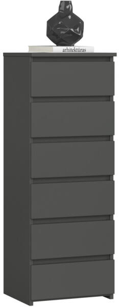 Modern, karcsú komód 6 tágas fiókkal, grafitszürke matt kivitelben. Kiváló minőségű, 16 mm-es kopásálló laminált bútorlapból készült, ABS élzárással a tartósság érdekében. Elegáns tárolási megoldás kis helyekreA CL6 keskeny komód tökéletes választás, ha maximalizálni szeretné a tárolóhelyet minimális alapterületen. A 40 cm széles, 109 cm magas bútor hat t