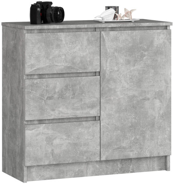 Modern, kompakt komód 3 fiókkal és 1 ajtóval, beton hatású kivitelben. Ideális tárolási megoldás bármely helyiségbe, kiváló minőségű 16 mm-es laminált lapból készült, ABS élzárással. Sokoldalú tárolási megoldás modern design-nalA Jerry komód egy praktikus és stílusos bútordarab, amely tökéletesen ötvözi a funkcionalitást és a modern designt. A beton hatású f