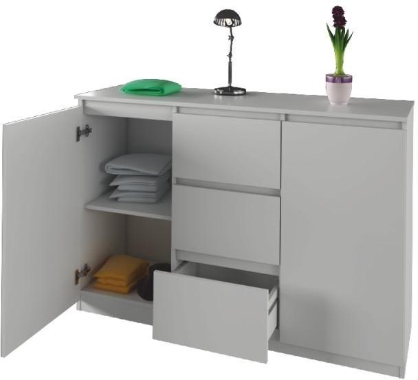 Dizájnos KELLY K2 komód, amely minőségi laminált 16 mm vastag bútorlapból készül. A bútor darab minden modern otthonba tökéletes választás. Számos tároló helyet kínál. A bal oldalon három tágas fiókkal rendelkezik, a jobb oldalon pedig a lamellákkal díszített ajtó található, amely mögött egy polc helyezkedik el. A dísz lamellák fekete színűek, ugyanúgy mint a fek