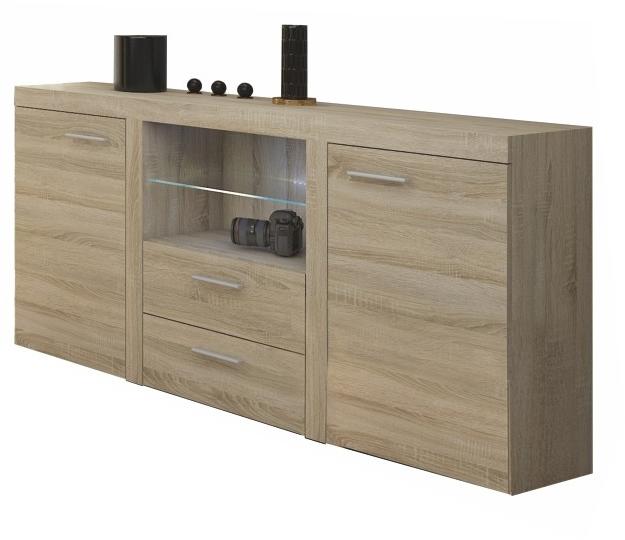 Nappali sor, DTD laminált, változat: fehér vagy sonoma tölgyfa, mérete(Szé/Ma/Mé): 270x190x40,2 cm, komód (Szé/Ma/Mé): 156, 4x80,5x40,2 cm. A nappali falhoz rendelhető LED világítás (fehér mintázat), az ára 7 800 HUF, a komódhoz is rendelhető LED világítás (fehér mintázat), az ára 6 500 HUF. Szín:: sonoma tölgy.