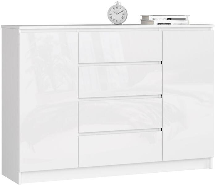 Modern, tágas komód 4 fiókkal és 2 ajtóval, magasfényű fehér akril frontokkal. A 138 cm széles bútor tökéletes tárolási megoldást kínál, miközben elegáns megjelenésével optikailag tágítja a teret. Elegáns tárolás modern kivitelbenEz a tágas komód ötvözi a praktikus tárolást az időtlen dizájnnal. A magasfényű fehér akril frontok és a matt fehér korpusz tökél