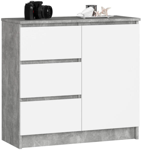 Kompakt és stílusos komód, amely ötvözi a beton és fehér színvilágot. Három fiókkal és egy ajtóval rendelkezik, ideális tárolási megoldást kínálva bármely modern otthonba vagy irodába. Modern tárolási megoldás minőségi kivitelbenA Jerry komód egy sokoldalú bútordarab, amely egyesíti a modern dizájnt a praktikus funkcionalitással. A beton és fehér színkombináció