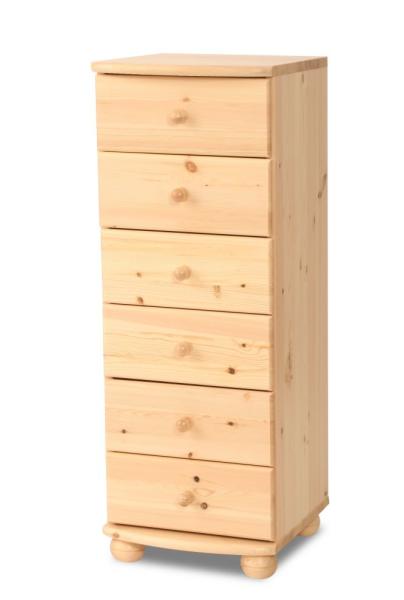 Szárított borovi fenyőből készülnek. Különböző komódok, szekrények, polcok. 40cm széles, 110cm magas, 45cm mély. Rendelhető natúr, pácolt , és ( színes ) kivitelben. Nem lapra szerelt. Az Anikó 6 fiókos keskeny komód ívelt kialakításával a klasszikus vonalakat követi. Alapanyaga skandináv borovi fenyő, összeszerelést nem igényel. Peremes nélküli kivitel, de kérhe