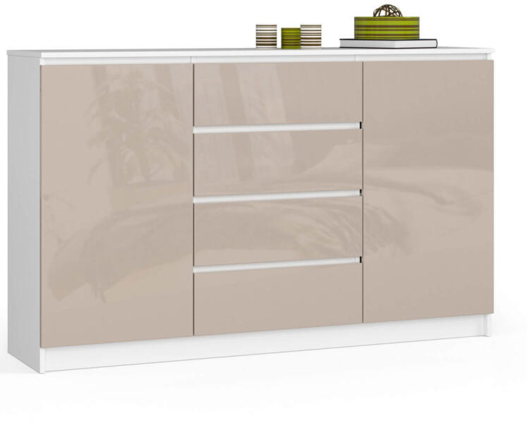 Modern, tágas komód fehér matt korpusszal és cappuccino magasfényű akril frontokkal. A 160 cm széles bútor 2 ajtóval és 4 fiókkal kínál bőséges tárolóhelyet, tökéletes választás a nappaliba vagy hálószobába. Elegáns tárolási megoldás modern otthonokbaEz a prémium minőségű komód tökéletesen ötvözi a funkcionalitást és a stílust. A fehér matt korpusz és a ca