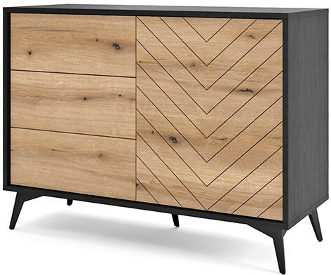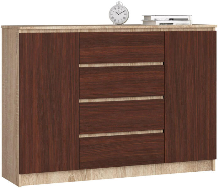 Modern, tágas komód Sonoma tölgy korpusszal és wenge frontokkal, amely 4 fiókkal és 2 ajtóval rendelkezik. Ideális tárolási megoldást kínál a nappali vagy hálószoba számára, kiváló minőségű 16 mm-es laminált lapból készült. Elegáns tárolási megoldás modern otthonokbaEz a prémium minőségű komód tökéletes egyensúlyt teremt a funkcionalitás és az esztétika kö