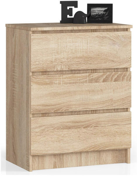 Kompakt, mégis tágas komód három fiókkal, amely kiváló minőségű, 16 mm-es kopásálló laminált lapból készült. A Sonoma tölgy színű kivitel tökéletesen illeszkedik a modern otthoni környezetbe, míg az ABS élzárás tartósságot biztosít. Elegáns tárolási megoldás modern otthonokbaEz a Sonoma tölgy színű komód tökéletes választás azoknak, akik praktikus, mégis