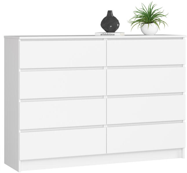Modern, skandináv stílusú fehér komód nyolc tágas fiókkal, amely tökéletes tárolási megoldást kínál. A laminált bútorlapból készült, ABS élzárással ellátott bútor egyesíti a funkcionalitást és az időtlen dizájnt. Elegáns tárolási megoldás skandináv stílusbanA K140 nyolcfiókos komód a modern otthonok ideális bútordarabja. A matt fehér kivitelezés és a letis