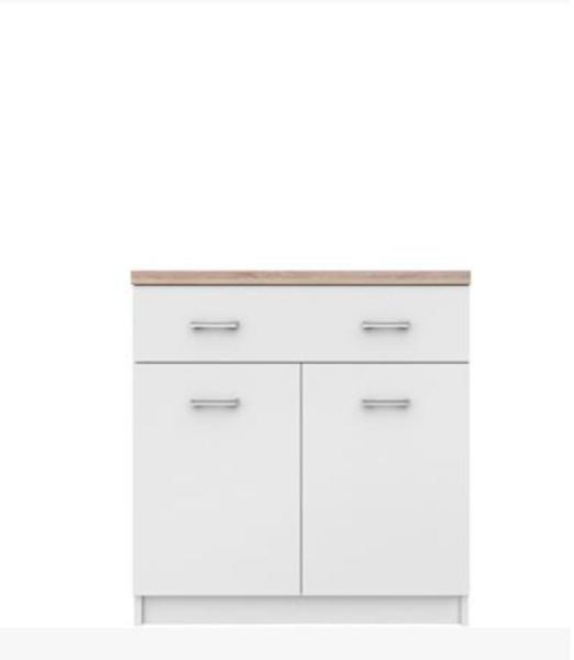 TOPTY, Komód 2d1s Anyag:DTD laminált, Szín: fehér / sonoma tölgyfa, Méretek ? komód (Sz x Ma x Mé): 80x85x33 cm Méretek ? ajtók (Sz x Ma): 39,6x55 cm Méretek ? fiókok (Sz x Ma): 80x18 cm A belső polc anyagának vastagsága: 1,8 cm A talapzat magassága: 8 cm