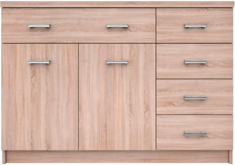 Komód 2D5S, sonoma tölgy, TOPTY TYP 22 Komód 2D5S TOPTY TYP 22 Anyag: laminált DTD Szín: sonoma tölgy Méretek (SzxMéxMa): 120x33x85 cm Fiók méretei (SzéxMa): 79,4x18 cm Négy egyforma nagyságú fiók Nagy fiók Kétajtós Ajtók méretei (SzéxMa): 39,6x54,6 cm Polcos Szétszerelve szállítva.