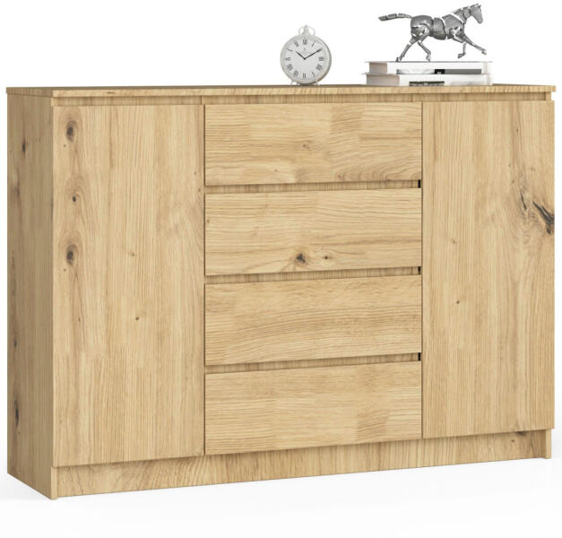 Termék részletekModern és praktikus komód 4 fiókkal és 2 ajtóval, amely tökéletes tárolási megoldást kínál. Az Artisan tölgy kivitel és a matt felület elegáns megjelenést kölcsönöz ennek a sokoldalú bútordarabnak. Elegáns tárolási megoldás modern otthonokbaEz a kiváló minőségű komód tökéletesen ötvözi a funkcionalitást és az esztétikumot. A 138 cm széles bútor 4 tágas fi