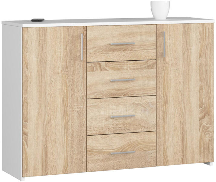 Termék részletekModern és praktikus komód 4 fiókkal és 2 ajtóval, amely tökéletes tárolási megoldást kínál. A fehér korpusz és sonoma tölgy frontok elegáns kombinációja harmonikusan illeszkedik bármilyen lakberendezési stílushoz. Elegáns tárolási megoldás modern otthonokbaAz AKORD K45 komód a funkcionalitás és az esztétikum tökéletes ötvözete. A 110 cm széles bútor 4 tágas fió