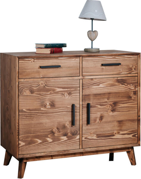 A komód teljes egészében tömör fenyőfából készült. A komód fekete környezetbarát lakkal és színtelen lakkal van lakkozva. Lapraszerelve érkezik! Ez a két fiókos komód teljes egészében tömör fenyőfából készült, amelyet rendkívül gondos és precíz kidolgozás jellemez. A komód fekete ökológiai lakkal és átlátszó lakkal van lakkozva, ami biztosítja a tökéletes
