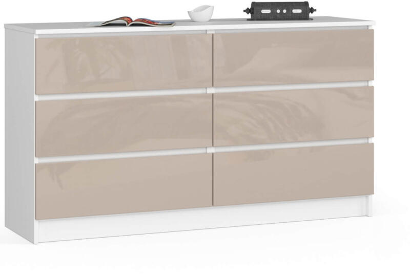 Termék részletekModern, 6 fiókos komód magasfényű cappuccino frontokkal és matt fehér vázzal. Tágas tárolóhelyet biztosít 138 cm szélességével és praktikus görgős fiókvezetőkkel rendelkezik. Elegáns tárolómegoldás modern otthonokbaEz a stílusos komód tökéletesen ötvözi a funkcionalitást és az esztétikát. A 138 cm széles bútor hat tágas fiókkal rendelkezik, amelyek görgős sí