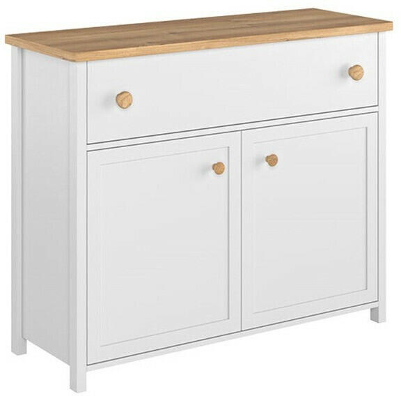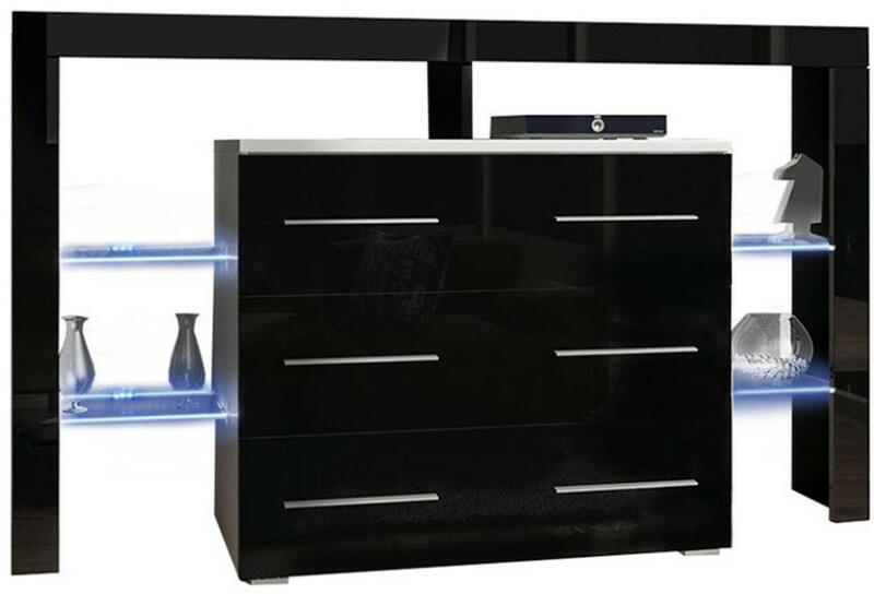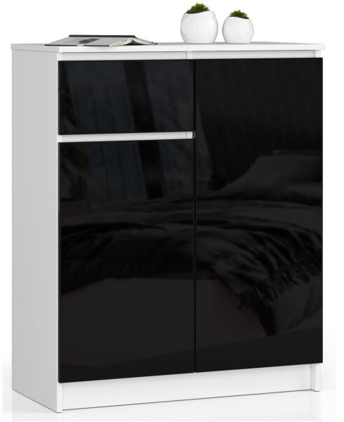 Termék részletekModern, elegáns komód fehér korpusszal és magasfényű fekete frontokkal. A 80 cm széles bútor egy fiókkal és két ajtóval rendelkezik, ideális tárolási megoldást kínálva a nappali vagy hálószoba számára. Elegáns tárolás modern kivitelbenEz a modern vonalvezetésű komód tökéletes egyensúlyt teremt a funkcionalitás és az esztétikum között. A fehér korpusz és a maga