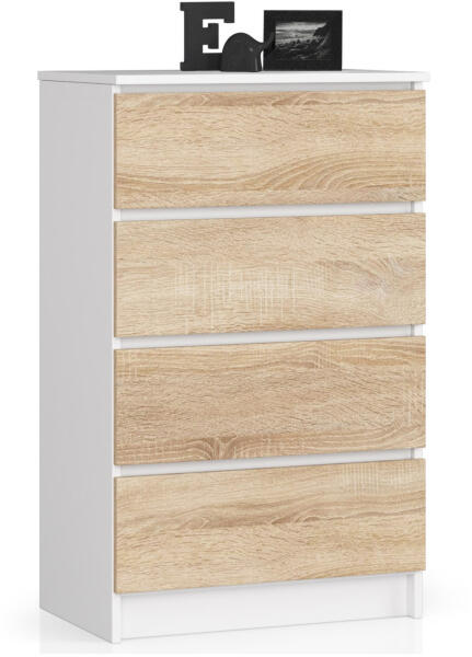 Modern, kompakt komód 4 tágas fiókkal, amely tökéletes tárolási megoldást kínál. A fehér korpusz és sonoma tölgy frontok elegáns kombinációja harmonikusan illeszkedik bármilyen lakberendezési stílushoz. Elegáns tárolási megoldás modern otthonokbaAz AKORD K60 komód a funkcionalitás és az esztétikum tökéletes ötvözete. A 60 cm széles bútor négy tágas fiókkal rende