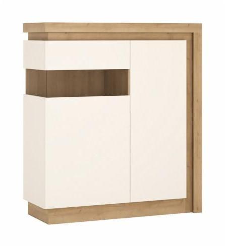 Termék részletekVitrin balos L-04, DTD laminált, ellenál a karcolásoknak. Változat: riviéra tölgy/extra magas fényű fehér HG. Mérete (Szé/Ma/Mé): 107x124x42 cm. Az ár tartalmazza a LED világítást. Rendelhető LED Squared világítás az üveges vitrinekbe: egysoros és kétsoros. Ajtó nyitás soft closing rendszerrel.