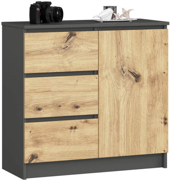 Termék részletekModern, kompakt komód egy ajtóval és három fiókkal, amely tökéletes tárolási megoldást kínál bármely helyiségben. A grafitszürke és artisan tölgy színkombináció elegáns megjelenést biztosít, míg a kiváló minőségű laminált lap tartósságot garantál. Sokoldalú tárolási megoldás modern designnalA Jerry komód egy praktikus és stílusos bútordarab, amely ötvözi