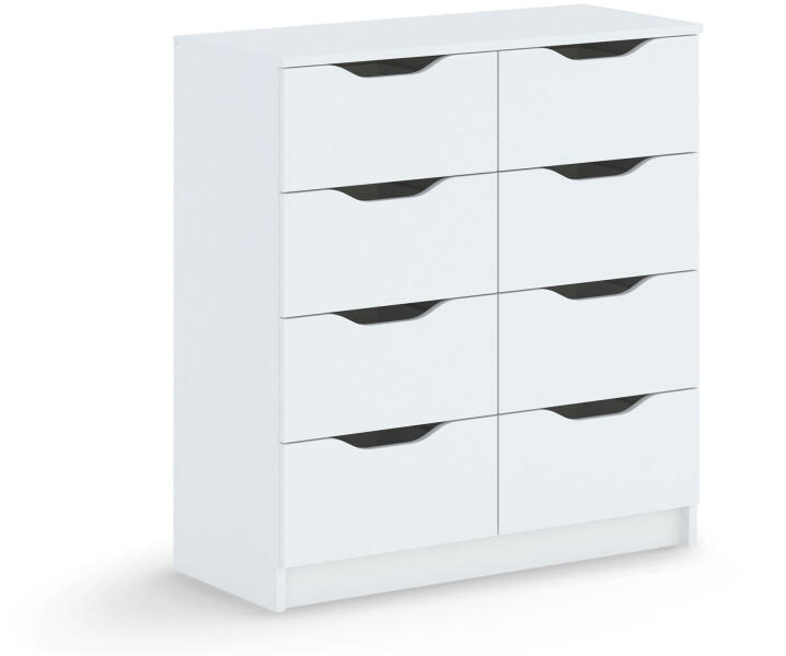 Minimalista stílusú fehér KELLY 8S komód, amely összesen nyolc fiókkal rendelkezik. Az 91 cm magasságának és a 81 cm szélességének köszönhetően számos tároló hellyel rendelkezik. Tökéletes irodai komód lehet, de a dolgozószobába is tökéletes. A széles komód minőségi 16 mm vastag laminált forgácslapból készült, amely garantálja az ellenálló képességét és a k