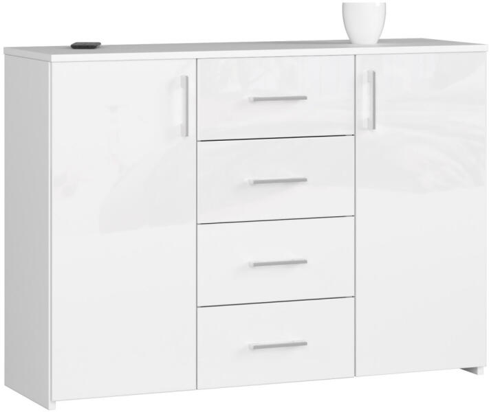 Termék részletekModern, magasfényű fehér komód 4 fiókkal és 2 ajtóval, amely tökéletes tárolási megoldást kínál. A 110 cm széles bútor kiváló minőségű MDF-ből készült, és elegáns ezüst fogantyúkkal van felszerelve. Elegáns tárolási megoldás modern otthonokbaA K45 komód a modern design és a praktikus funkcionalitás tökéletes ötvözete. A magasfényű fehér kivitel és a letis