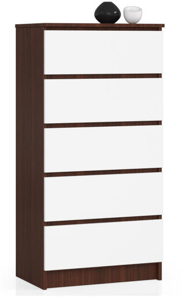 Termék részletekElegáns és praktikus 5 fiókos komód wenge színű vázzal és fehér frontokkal. A 16 mm-es kopásálló laminált lapból készült bútor tökéletes tárolási megoldást kínál 60 cm szélességével és 121 cm magasságával. Modern tárolási megoldás stílusos kivitelbenEz a kétszínű komód tökéletesen ötvözi a funkcionalitást és az esztétikumot. A wenge színű váz és a f