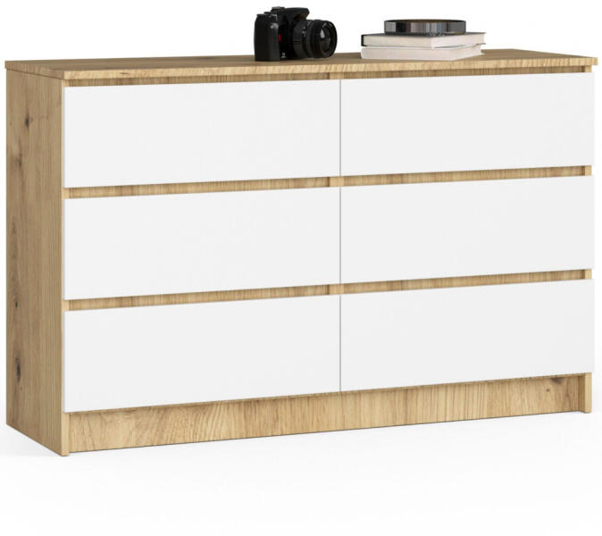 Termék részletekModern, 120 cm széles komód 6 tágas fiókkal, artisan tölgy korpusszal és matt fehér frontokkal. Kiváló minőségű laminált bútorlapból készült, ABS élzárással a tartósság érdekében. Elegáns tárolási megoldás modern otthonokbaEz a stílusos komód tökéletesen ötvözi a funkcionalitást és az esztétikumot. A 120 cm széles bútor artisan tölgy korpusza és matt fehér