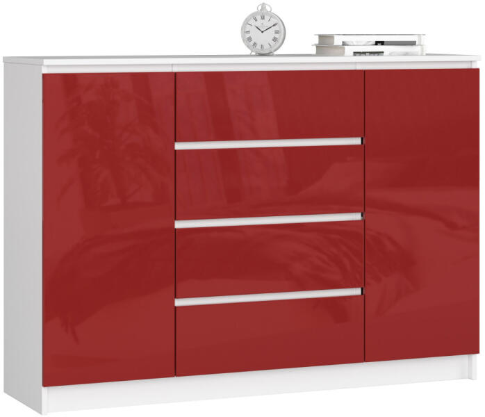 Termék részletekModern, tágas komód 4 fiókkal és 2 ajtóval, magasfényű piros akril frontokkal és matt fehér korpusszal. Tökéletes tárolási megoldás a nappali vagy hálószoba számára, elegáns megjelenéssel párosítva. Elegáns tárolási megoldás modern otthonokbaEz a modern vonalvezetésű komód tökéletesen ötvözi a funkcionalitást és a stílust. A magasfényű piros akril frontok és