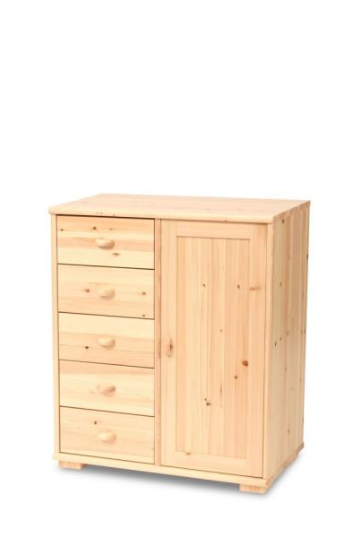 Használható pelenkázó komódnak is, a magassága megfelelő. Kérhető jobbos vagy balos kivitelben. A Vanessa 5 kisfiókos 1 ajtós komód egyenes vonalaival a letisztult stílus kedvelőinek készül. Alapanyaga skandináv borovi fenyő, összeszerelést nem igényel. Belül két fix polc található, belső mélysége 37 cm A fiókok lakkozott és pácolt kivitelben is görgős fióksínnel