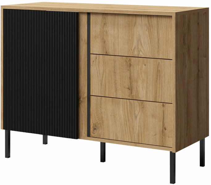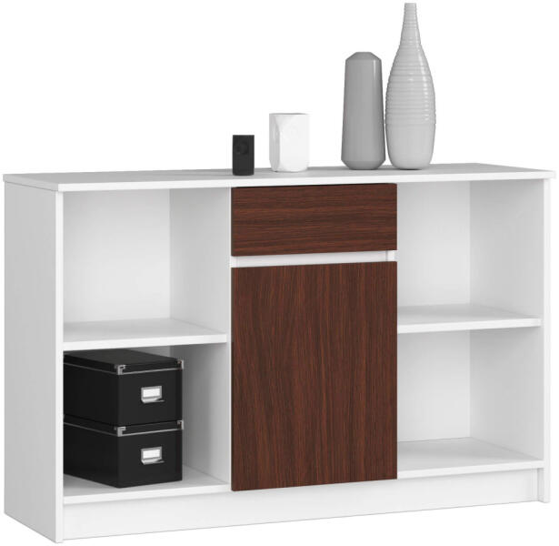 Modern, sokoldalú komód egy fiókkal és egy ajtóval, amely tökéletes tárolási megoldást kínál. A fehér korpusz és wenge frontok elegáns kontrasztja, valamint a 120 cm-es szélesség ideálissá teszi bármely helyiségbe. Elegáns tárolási megoldás modern otthonokbaA B-17 komód egy praktikus és stílusos bútordarab, amely ötvözi a modern dizájnt a funkcionalitással. A fehé