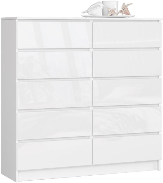 Modern, 10 fiókos fehér magasfényű komód kiváló minőségű MDF és akril anyagokból. Tágas tárolóhelyet biztosít 120 cm szélességével és praktikus görgős fiókvezetőivel. Elegáns tárolási megoldás modern otthonokbaEz a prémium minőségű, 10 fiókos komód tökéletes választás azoknak, akik nagy tárolókapacitást keresnek stílusos kivitelben. A magasfényű fehér f