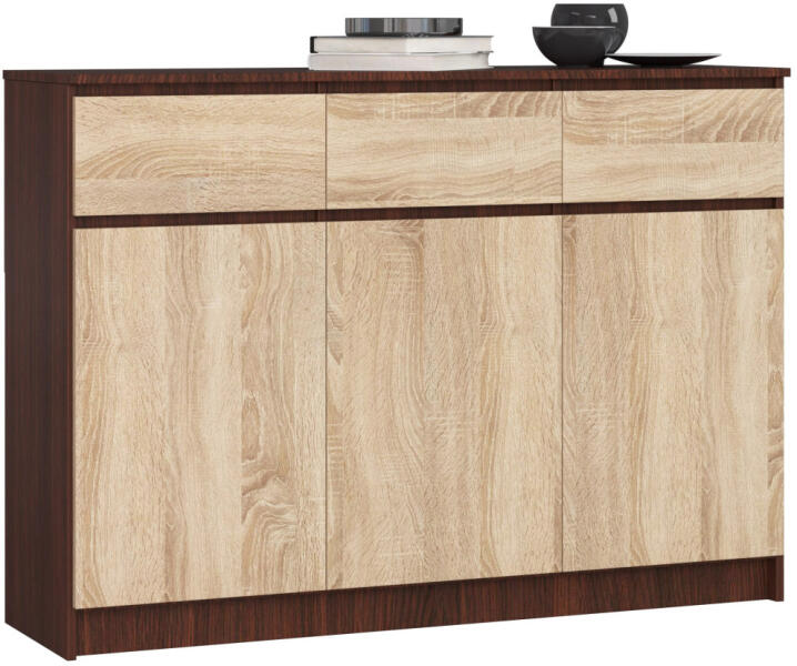 Modern, tágas komód 3 fiókkal és 3 ajtóval, amely tökéletes tárolási megoldást kínál. A wenge színű test és sonoma tölgy frontok elegáns kontrasztot alkotnak, míg a 138 cm széles kivitel bőséges tárolóhelyet biztosít. Elegáns tárolási megoldás modern otthonokbaEz a sokoldalú komód ötvözi a praktikus tárolást az esztétikus megjelenéssel. A 138 cm széles, 99 cm m